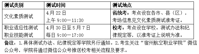 已参加安徽省2023年普通高校招生考试报名并取得考生号的考生,于2023年3月28日10:00至4月2日16:00,登录gkbm.ahzsks.cn填报宿州航空职业学院及专业志愿。报名流程详见省教育招生考试院网站(www.ahzsks.cn)公告栏或安徽省教育招生考试院微信公众号。普通高中毕业生可填报3个专业志愿和1个专业服从志愿,中职毕业生可填报1个专业志愿和1个专业服从志愿。